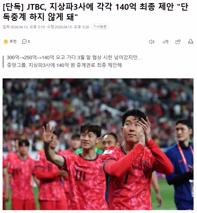 JTBC, 지상파3사에 각각 140억 최종 제안, 첫 제안은 300억, 방송사가 원하는 건 100억