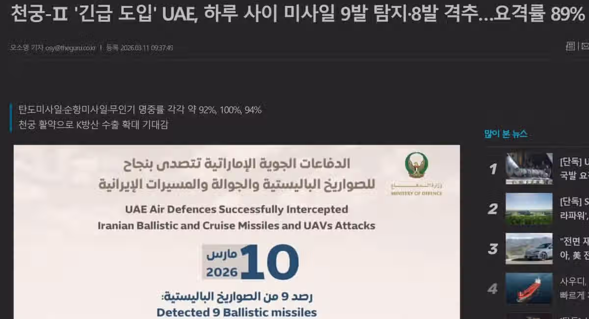 천궁-Ⅱ '긴급 도입' UAE, 하루 사이 미사일 9발 탐지·8발 격추…요격률 89% ㄷㄷ