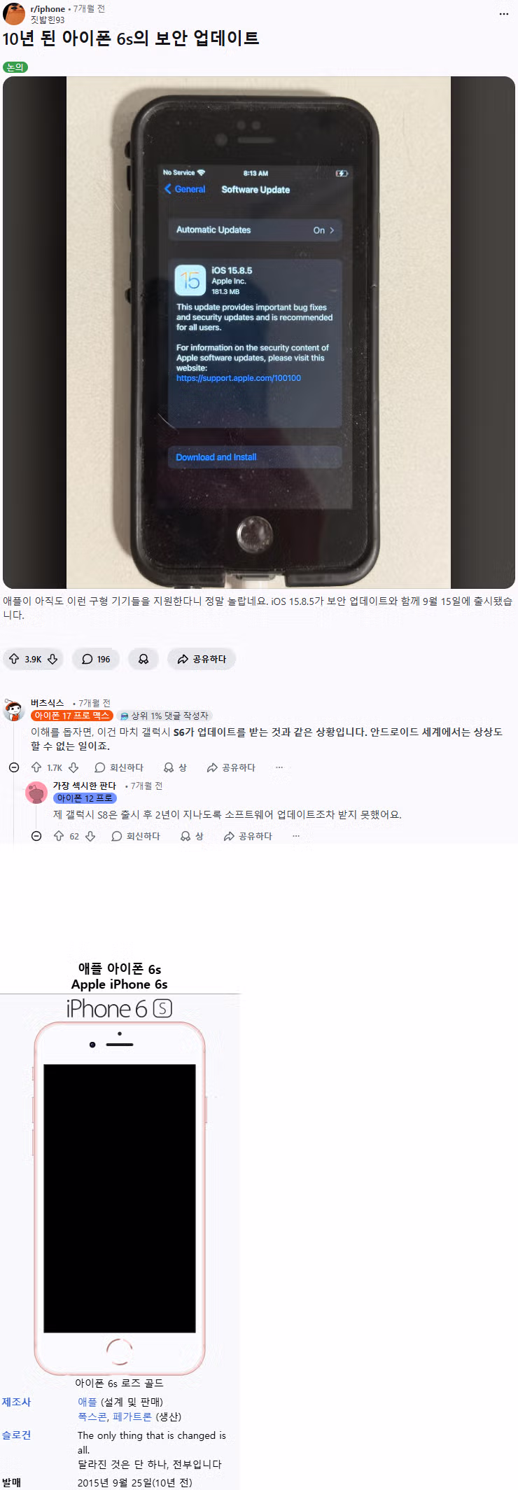 예전 폰이 아이폰 6인데(2014년 모델) 6이랑 6s도(2015년 모델) 같은 6이긴 한데 맥os 업뎃? 지원에선 뭔가 갈리는 거 같음. 지금 쓰는 거도 xs인데(2018년 모델) 신상 나올 때마다 살까 말까 했는데 12, 13, 14 다 보내고 2026년엔 18 나온다함. 근데 여전히 xs가 배터리 성능이 75%가 된 거 외엔 뒤지질 않고 아주 잘됨. 심지어 배터리 성능도 교체 가능한 때가 있었는데 귀찮아서 안 받음. 삼성폰은 2~3년 쓰면 엄청 느려지다 전원이 안 들어오는 경험이 아주 많았어서 서비스 센터가면 M/B 불량이라고 교체비용으로 구매비의 반에 해당되는 금액을 내야 한다고 함. 그러면 새 폰을 사지하다가 애플로 갈아탐.