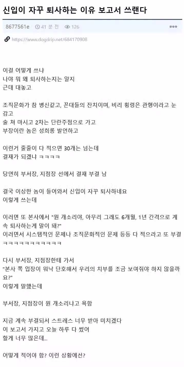 신입이 자꾸 퇴사하는 것에 대한 보고서 압박 받는 직원