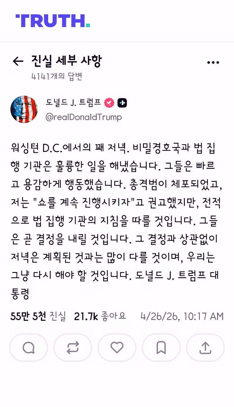 총격 사건 직후 트럼프 소셜 업데이트..30분뒤 기자회견