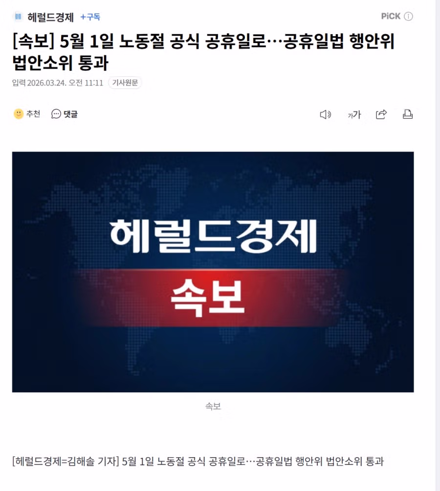 속보) 5월 1일 공식 공휴일 지정