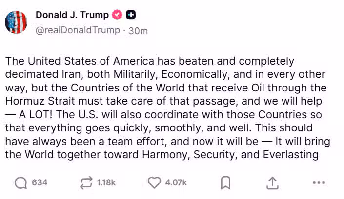트럼프) 호르무즈 해협을 이용하는 국가들이 책임져야 한다