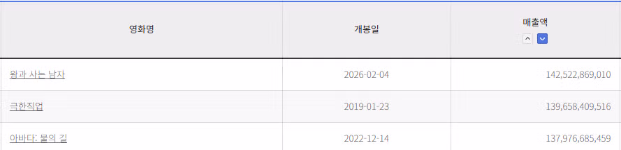 매출 1위는 뭐지 티켓 많이 팔린거 머 그런건가?