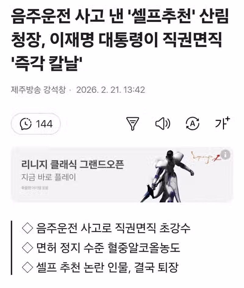 음주운전 사고 낸 셀프추천 산림청장, 이재명 대통령이 직권면직 즉각 칼날