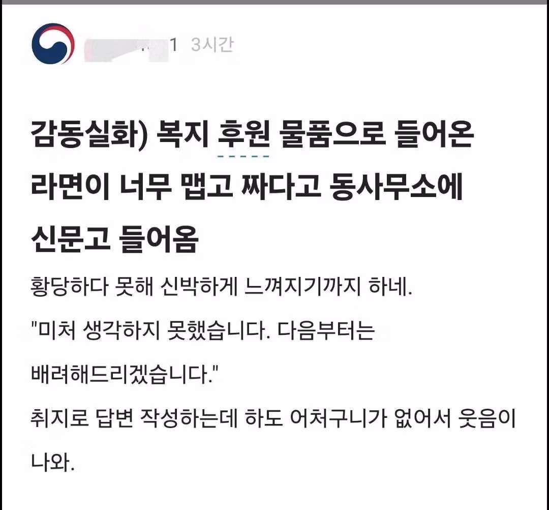 복지로 후원받은 라면이 맵다고 민원이 들어옴