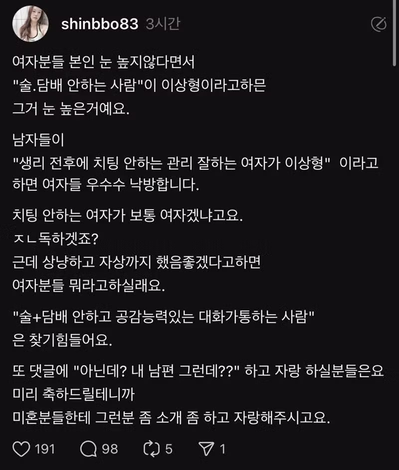술 담배 안 하는 남자가 이상형이면 눈이 높은 것