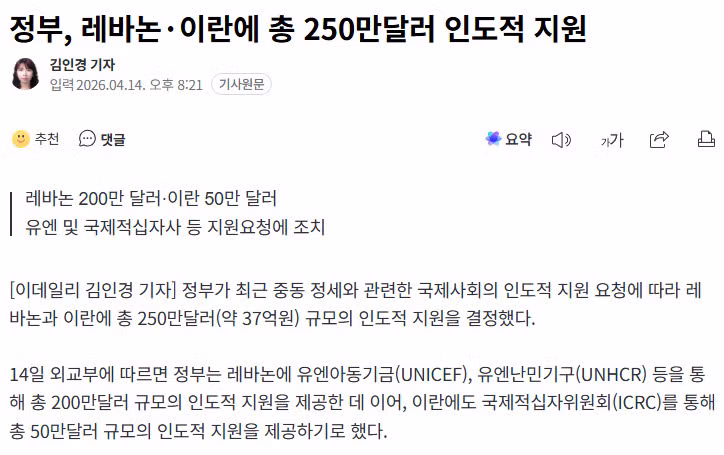 정부, 레바논·이란에 총 250만달러 인도적 지원