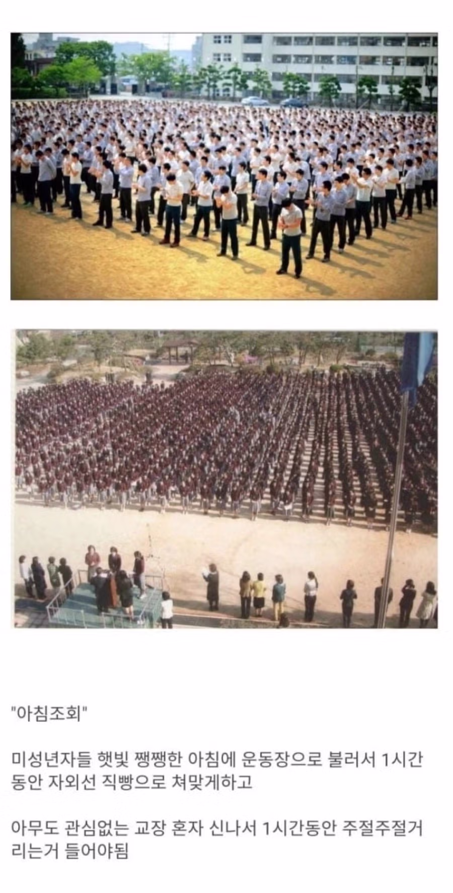 분명 선생님들도 다 싫어했을텐데... 의무사항이었나 그때나 지금이나 아침조회 왜했는지 모를.. 저때도 교내방송 다 됐었는데