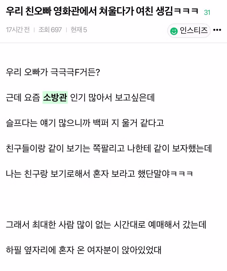 어쩐지 소방관 개봉했을때 혼자 온 남자들이 많더라고