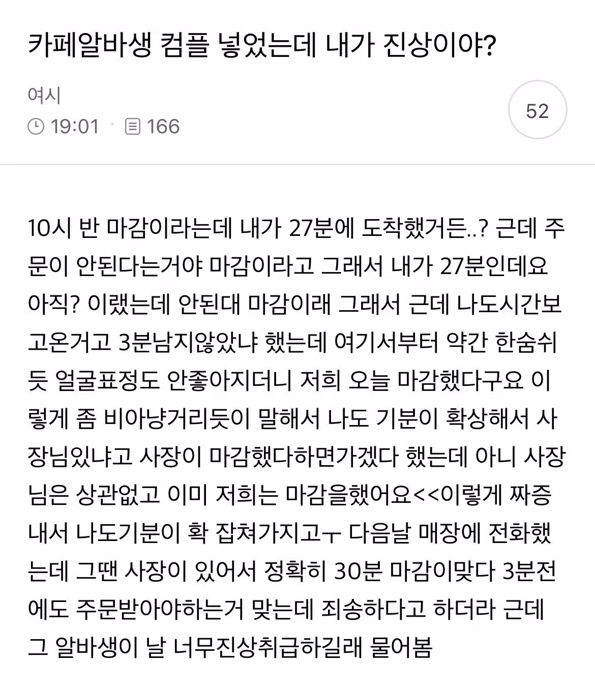 [댓글수정]마감이라고하면 나가면 됨 결국은 안해줘서 컴플넣었다는건데 세상 참빡빡하게사는듯 너무 피곤할거같음 진심