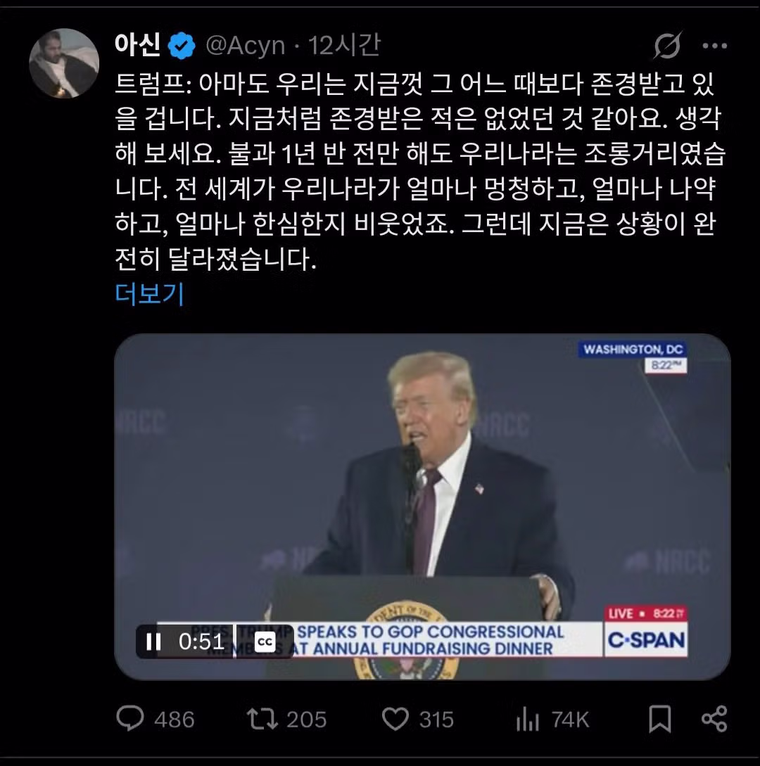 트럼프 연설) "내 덕분에 미국의 국격이 역대 최고 수준이다!"