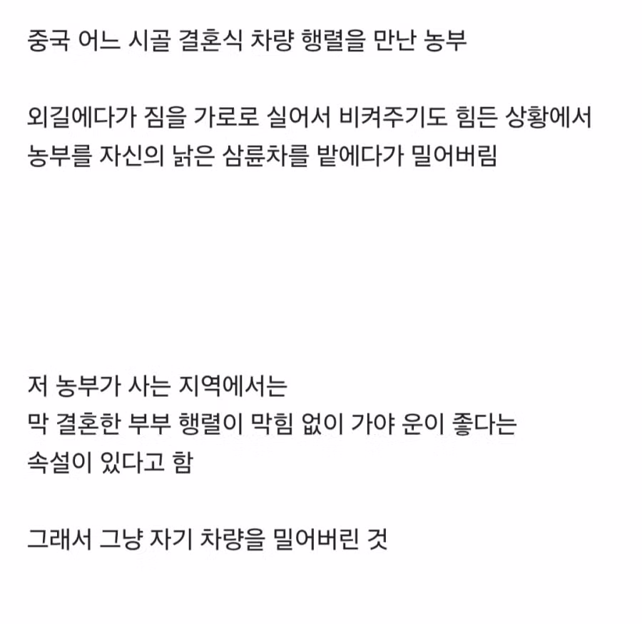 외길에서 결혼식 차량을 만난 중국 농부의 행동
