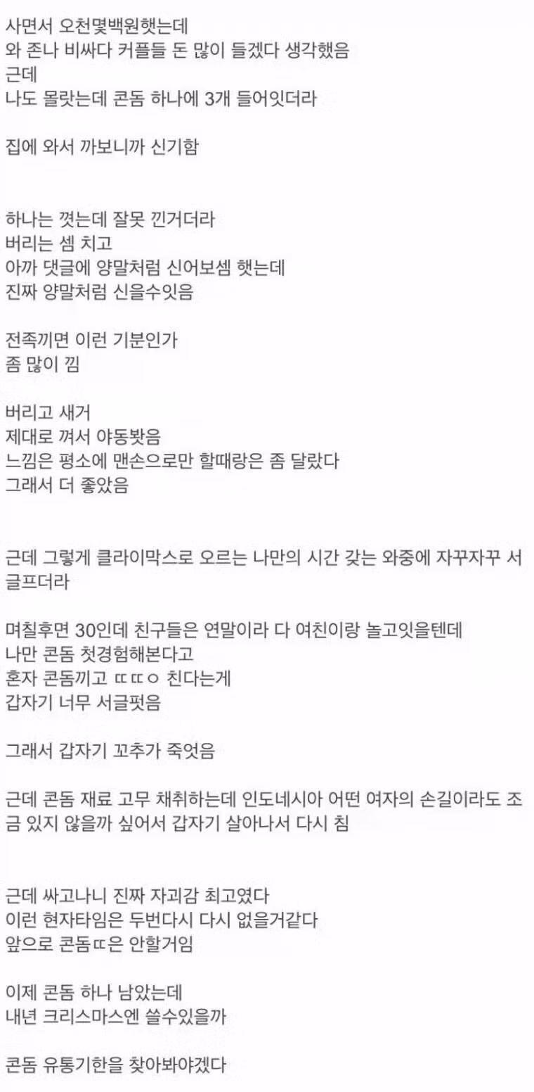 근데 콘돔 끼고 혼자 하면 깔끔하긴 함 친구한테 들음