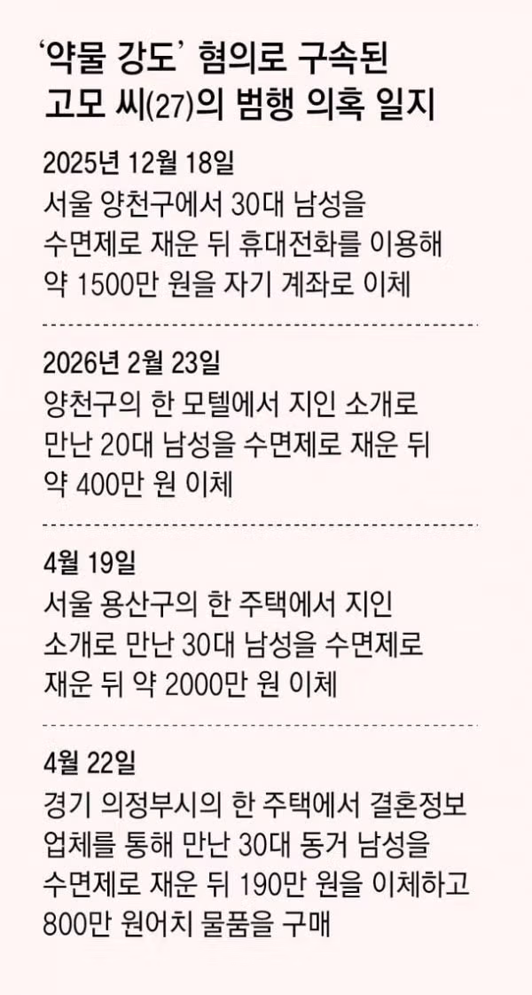 [단독]또 20대 여성 ‘수면제 연쇄 범죄’…남성 4명 재운후 4890만원 뜯어