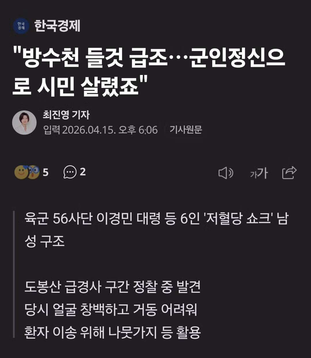대령 등 장교 6명, 도봉산에서 저혈당 쇼크 시민 살려