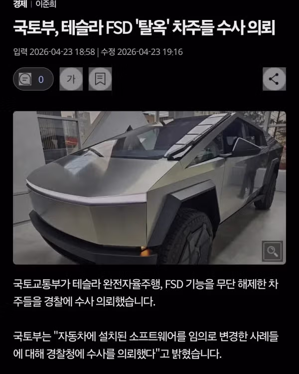 국토부, 테슬라 FSD '탈옥' 차주들 수사 의뢰