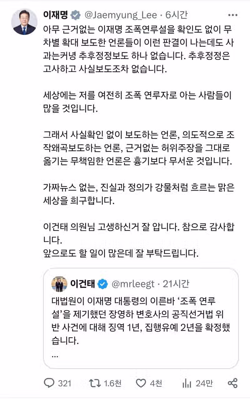 오늘자 이재명 대통령 SNS