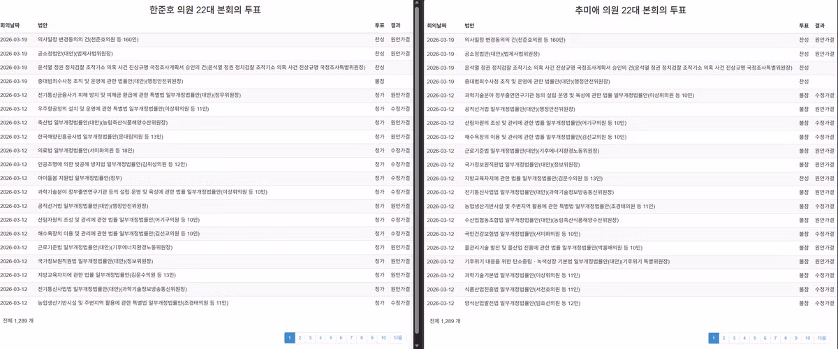 추미애 vs 한준호 3월 국회 본회의 투표 참가 여부비교