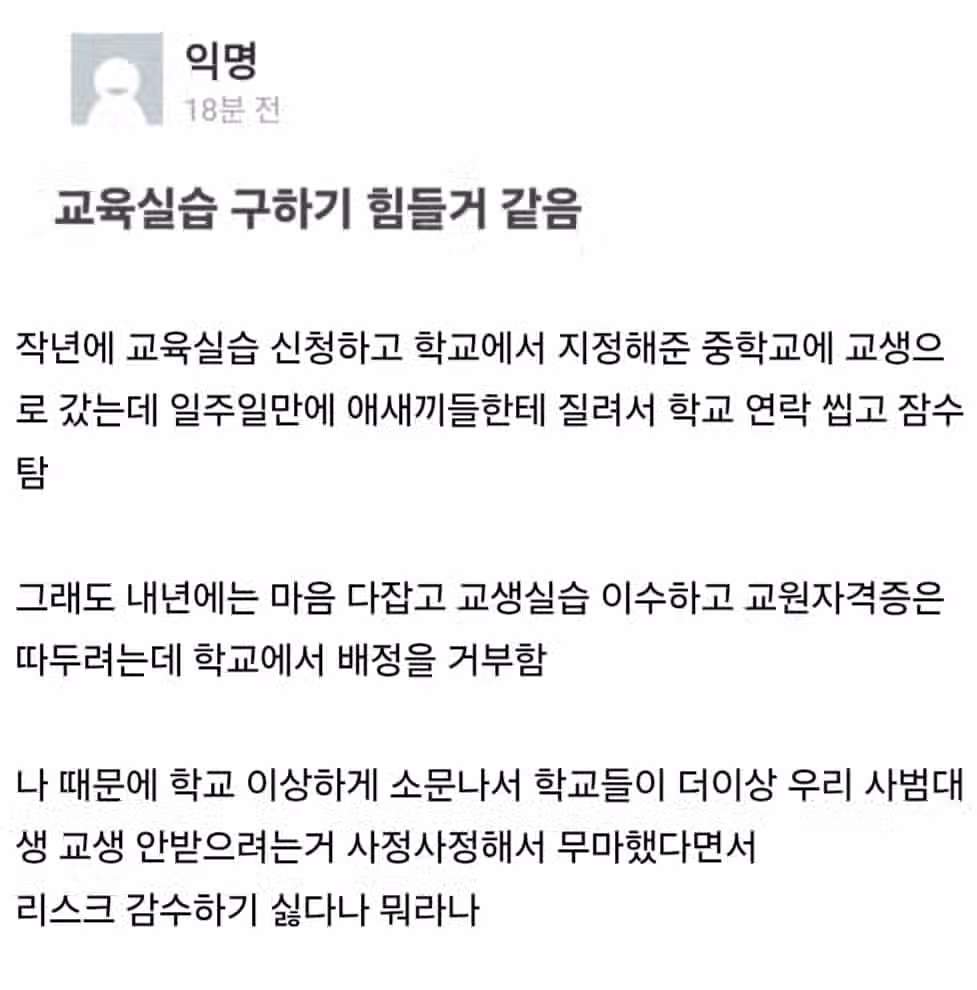 사범대 다니는데 실습 잠수 탔다고 학교에서 엿먹임