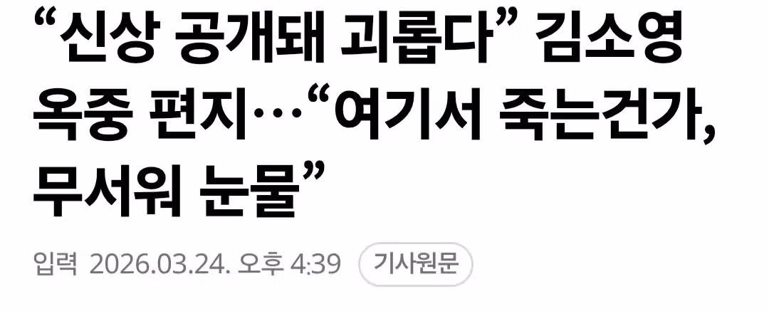 “신상 공개돼 괴롭다” 김소영 옥중 편지…“여기서 죽는건가, 무서워 눈물”