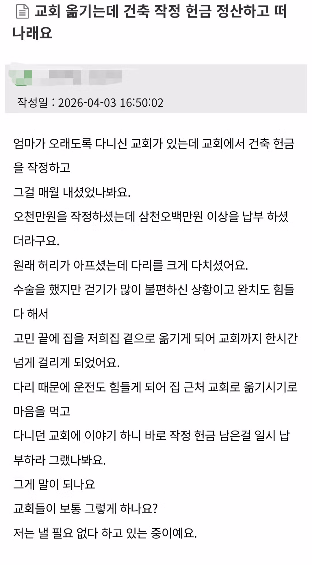 (펌)교회 옮기는데 건축 작정 헌금 정산하고 떠나래요