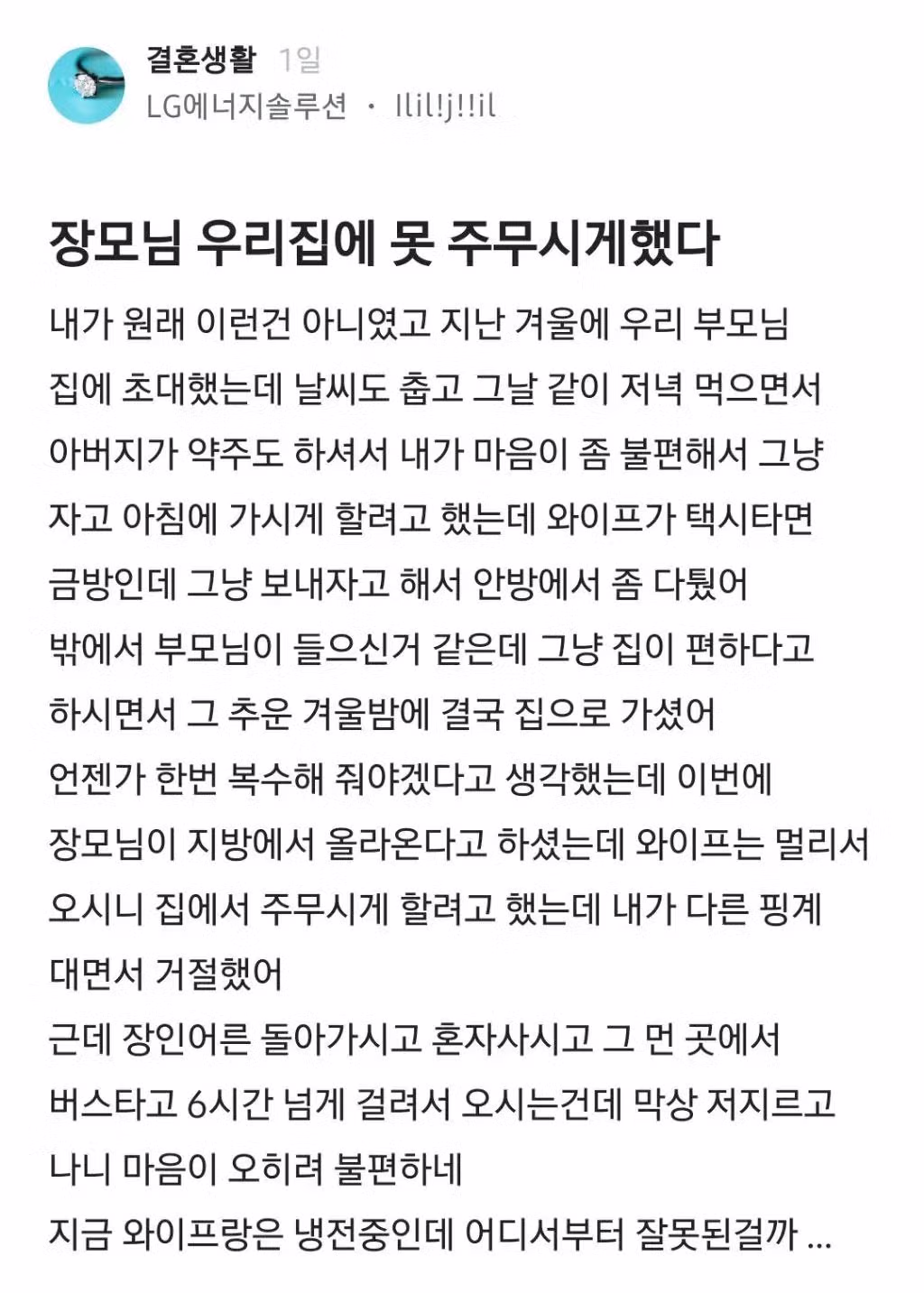 걍 솔직히 말해야지 핑계대지말고니 부모 내 부모 가릴거면 갈라서고 니 부모 대접받고 싶으면 똑같이 하라고