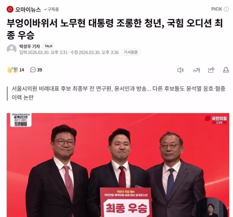 부엉이바위서 노무현 대통령 조롱한 청년, 국힘 오디션 최종 우승