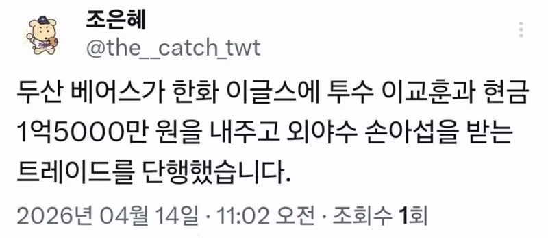 두산 이교훈 - 한화 손아섭 트레이드 오피셜