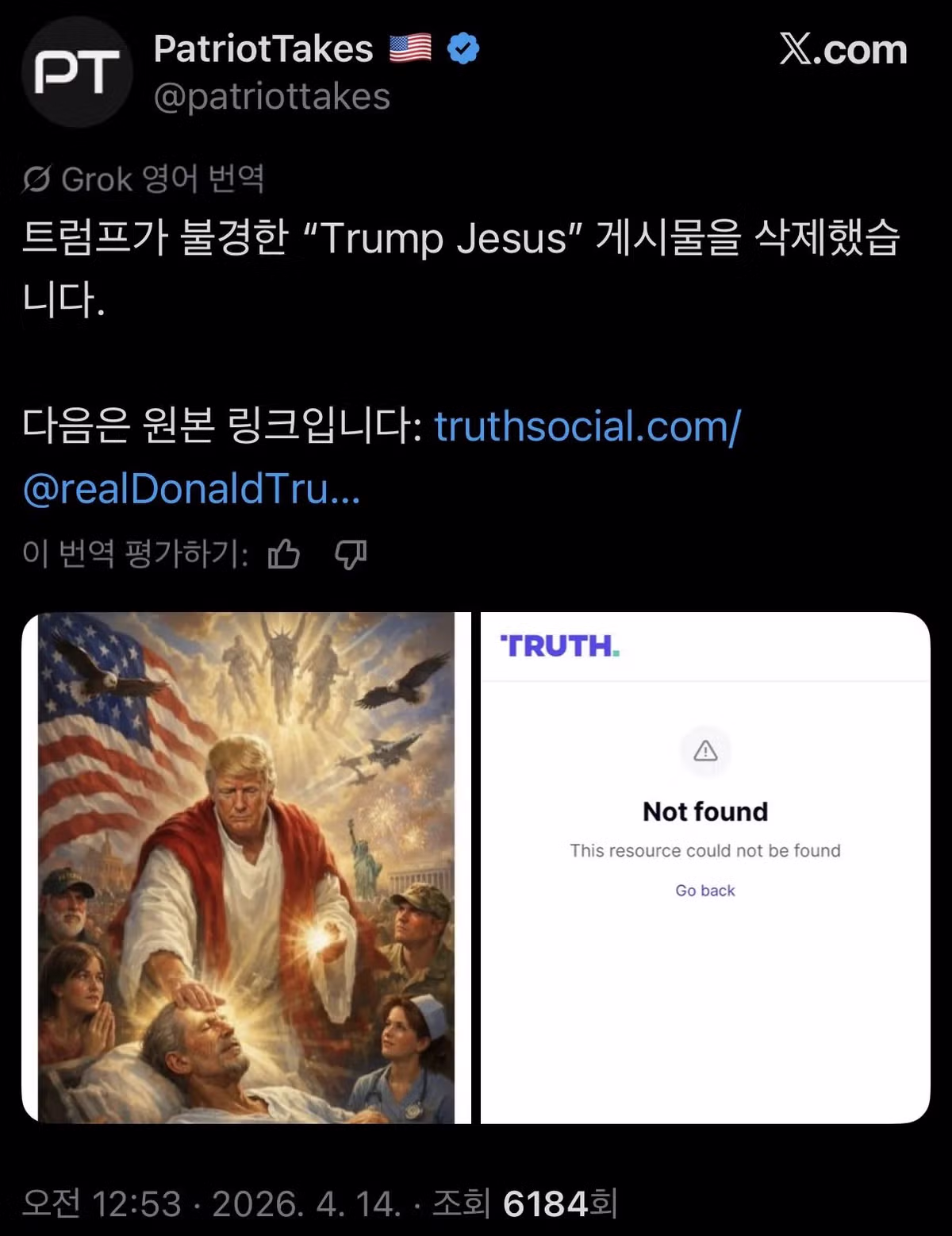 트럼프, 본인을 예수로 묘사한 신성모독짤 삭튀..JPG