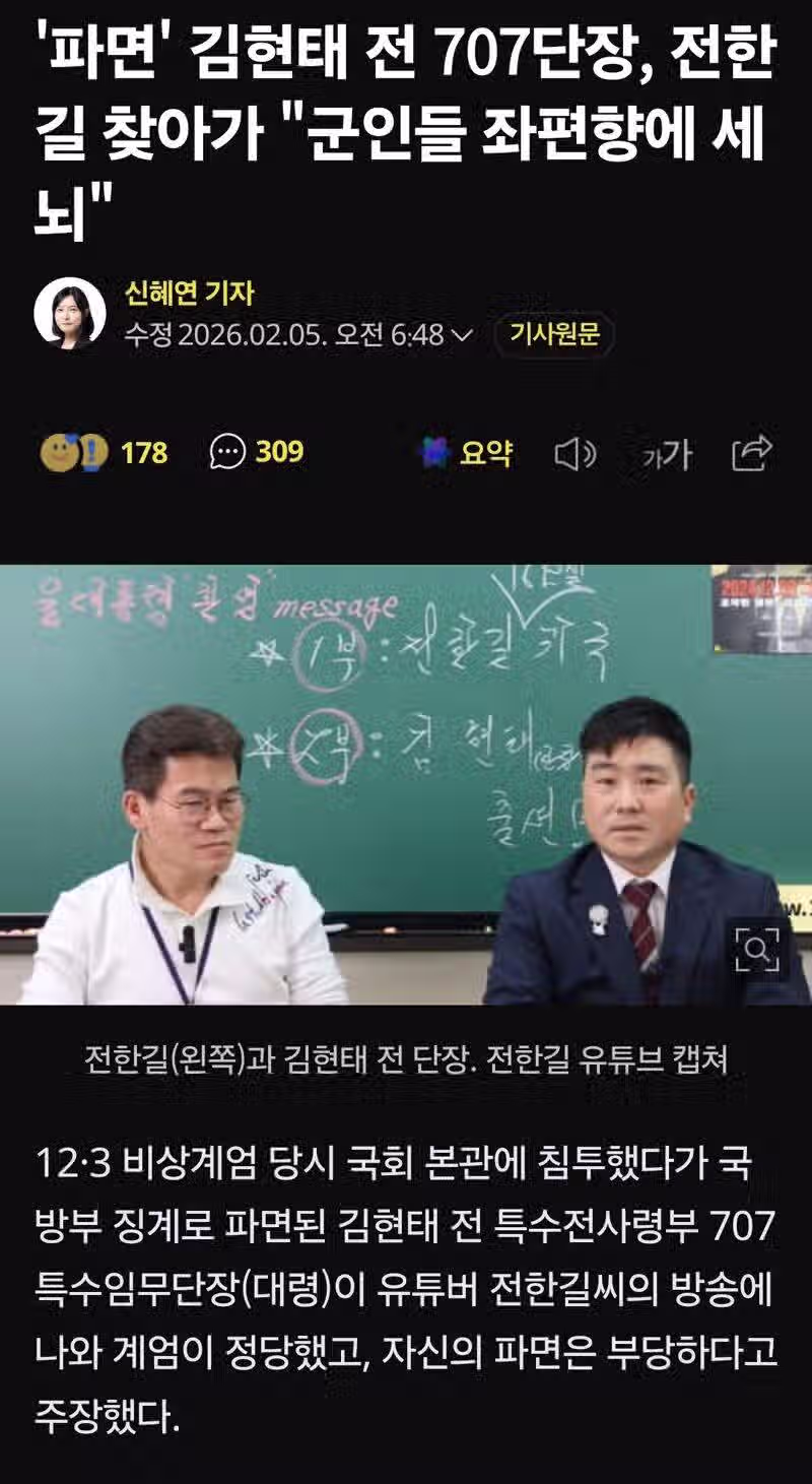 '파면' 김현태 전 707단장, 전한길 찾아가 "군인들 좌편향에 세뇌"