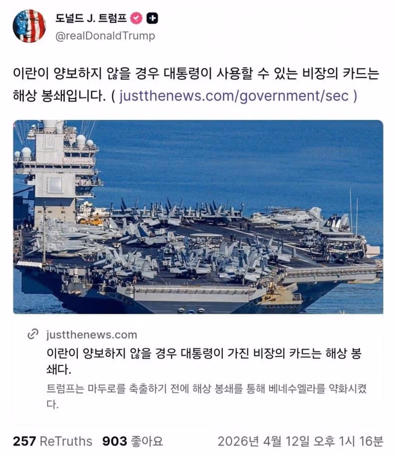 트럼프 "이란, 양보 안하면 미국이 호르무즈 봉쇄"
