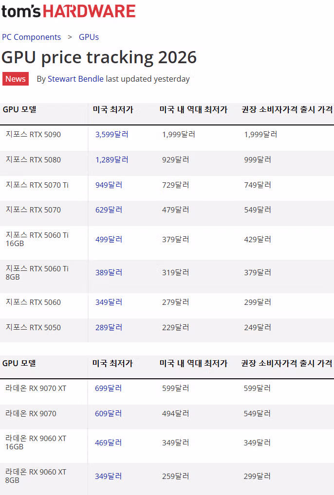 GPU 가격 비교 - 현재 최저가 vs 역대 최저가 vs 권장 소비자 가격