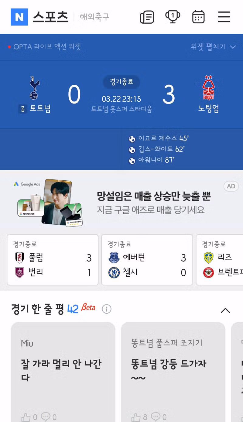 토트넘..노팅엄에게 3 대 0 패배