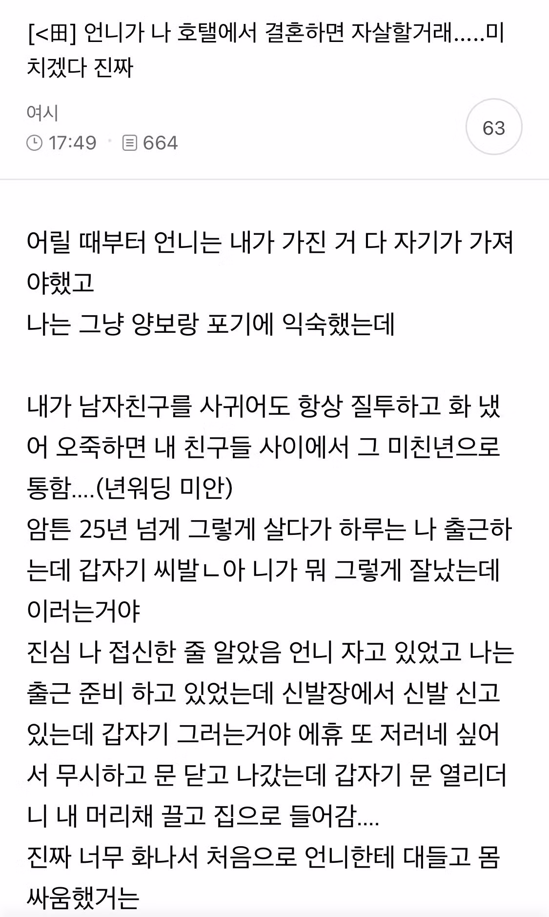 언니가 나 호텔에서 결혼하면 자살할거래