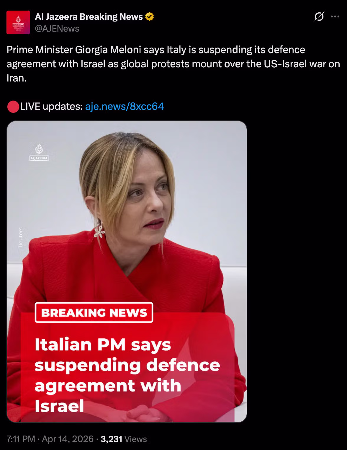 [속보] 이탈리아, 이스라엘과 방위 협정 중단