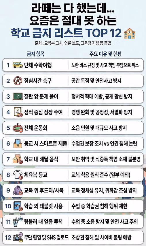 틀린자료가 많네요.. ai가 짜집기 해서 만드니 수학여행 금지도 아니죠. 학교 자체적으로 축소하는거지 권고나 지시 내려온 사항도 아닙니다.