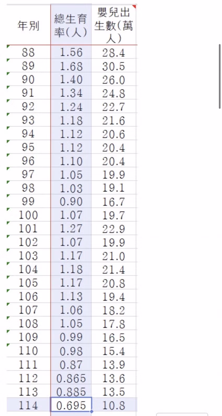 대만) 출산율 0.695
