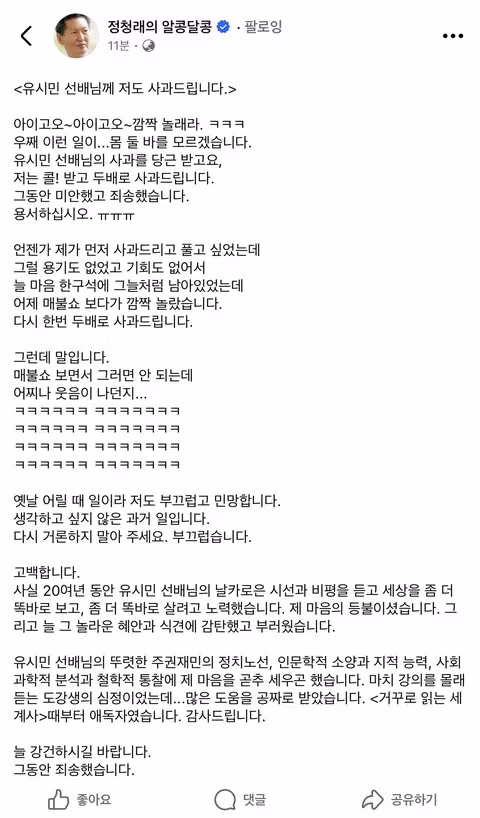 유시민 작가의 사과에 화답한 정청래 당대표