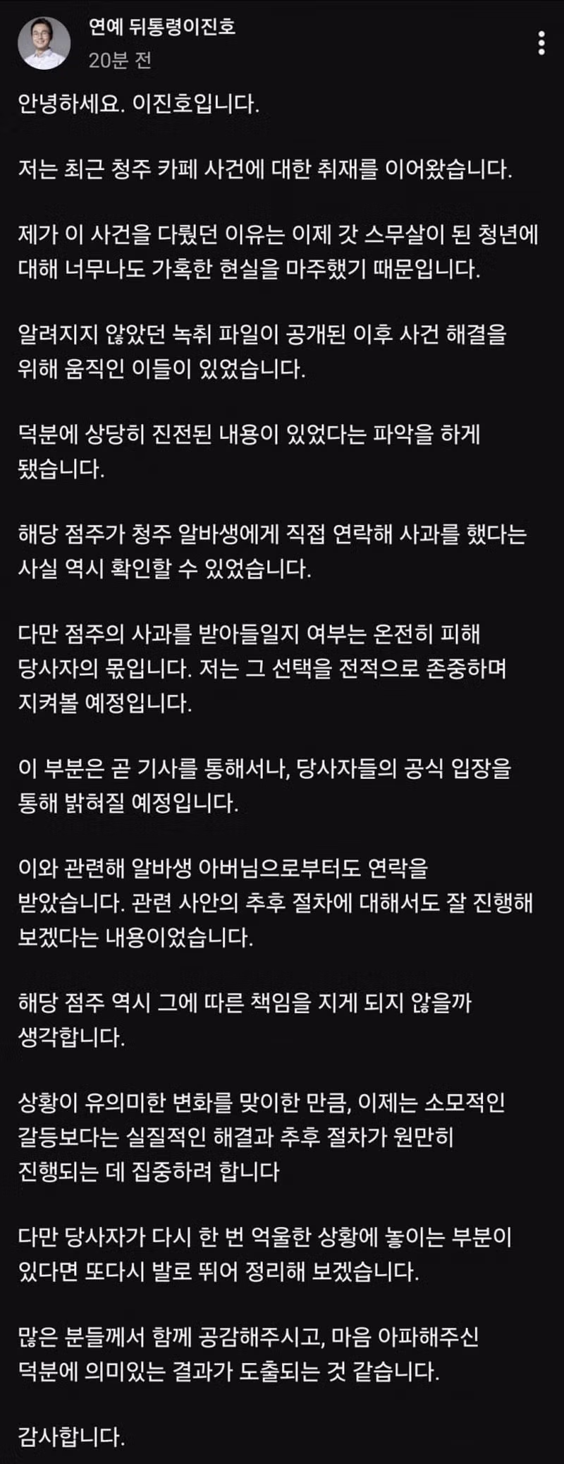청주카페사건) 점주가 피해자에게 전화해서 사과했다는 글이 올라왔네요
