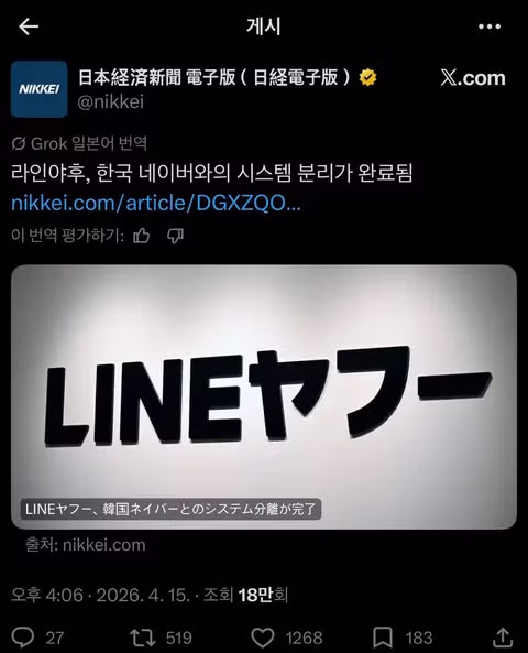 라인야후, 한국 네이버와 시스템 분리가 완료되었답니다.