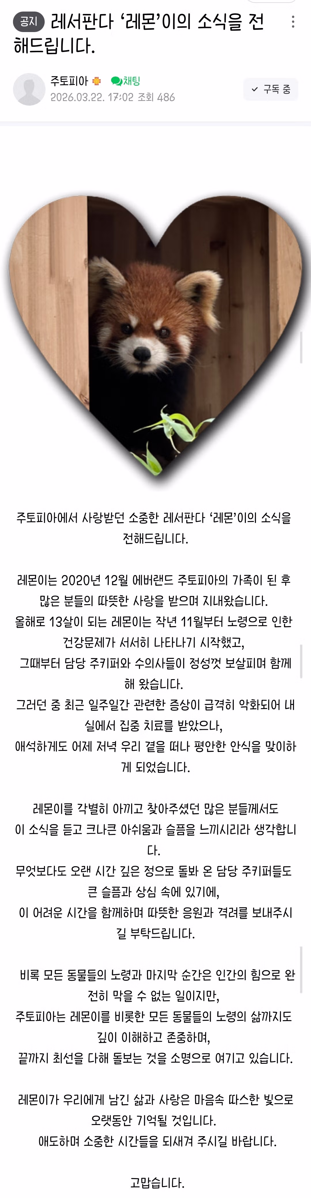에버랜드 레서판다 '레몬'이 어제 저녁 레서판다별로 돌아감
