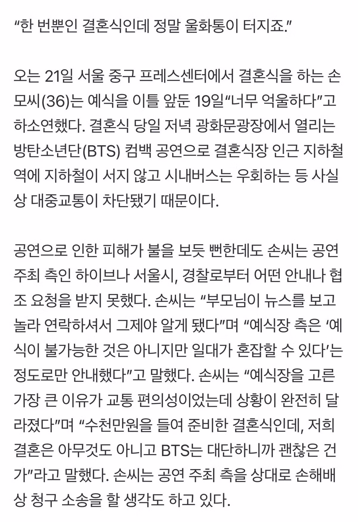 “수천만원을 들여 준비한 결혼식인데, 저희 결혼은 아무것도 아니고 BTS는 대단하니까 괜찮은 건가”라고 말했다. 손씨는 공연 주최 측을 상대로 손해배상 청구 소송을 할 생각도 하고 있다.