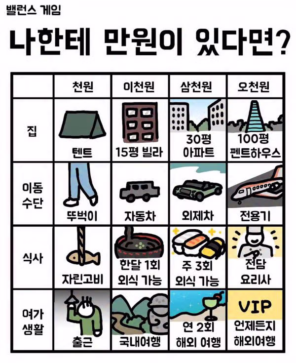 어차피 안되는거라 논할건 없지만 글쓴님 생각에 반박하자면 오천원으로 100평 팬트나 전용기만 팔아도 30평 아파트 외제차 주 3회외식 가능