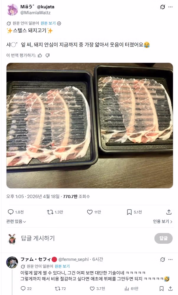 고기를 저렇게 썰수있다고??? 본적도 없음. 아니 어떻게 고기 뒤에 사물이 선명하게보여