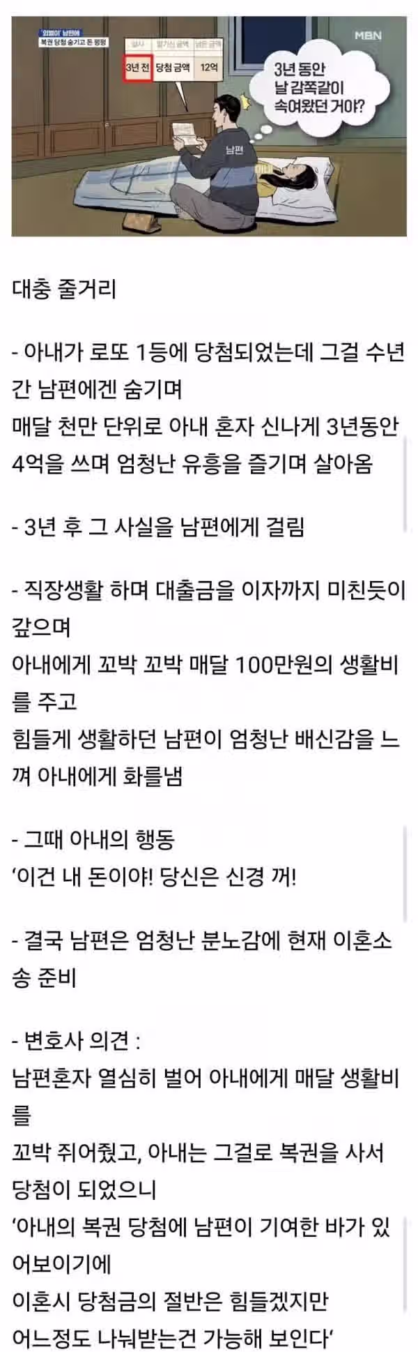아내가 로또 당첨 사실 숨기고 혼자 돈 쓰다가 발각