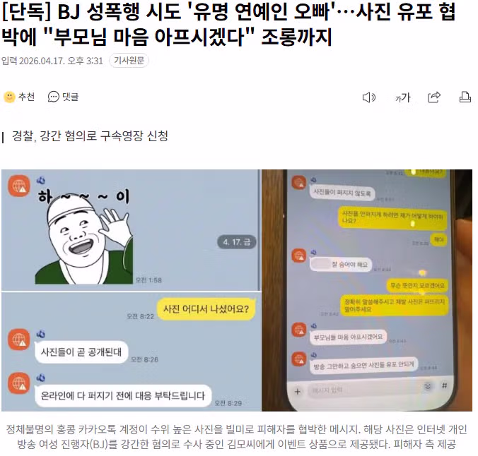 [단독] BJ 성폭행 시도 '유명 연예인 오빠'…사진 유포 협박에 "부모님 마음 아프시겠다" 조롱까지