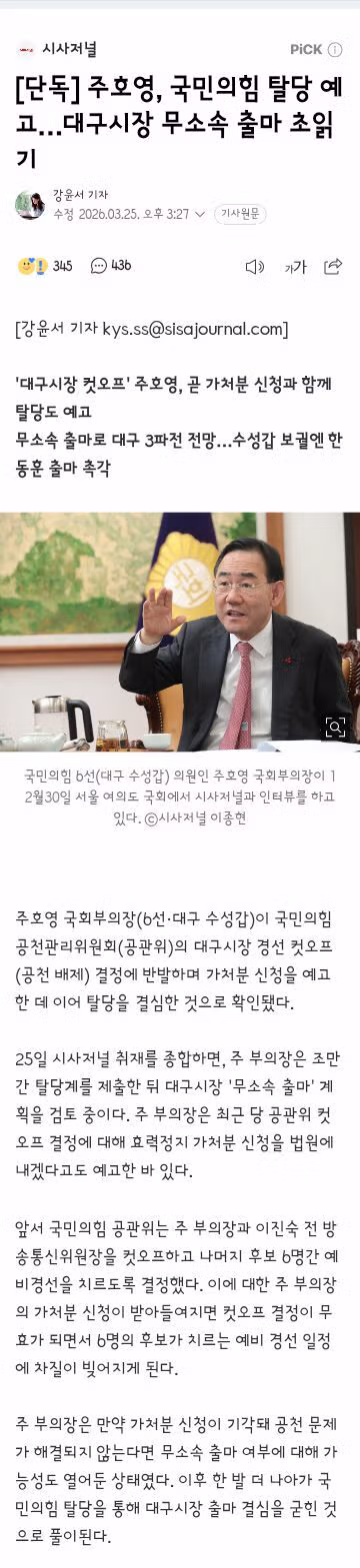 대구는 김정은이 내려와서 국짐당으로 나오면 뽑힐듯