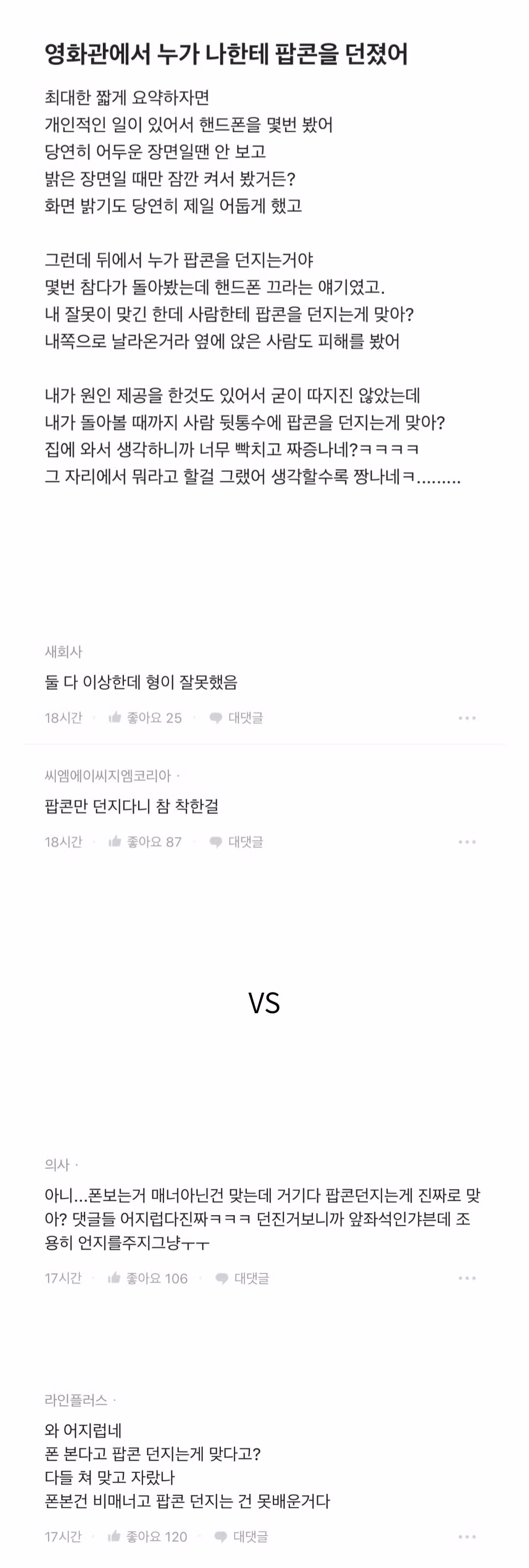 개극혐이지만 그렇다고 팝콘던지는게 맞다고?? 먼자리도 아닌것 같은데 차라리 말을하거나 발로차