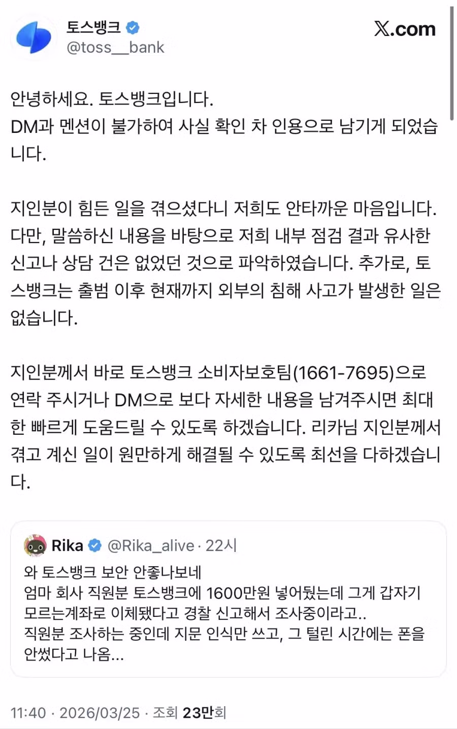트위터로 토스뱅크 관련 허위사실 뿌리다 딱걸린 사람